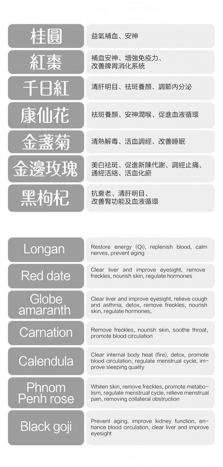 Ingredients: Longan, Red Dates , Globe Amaranth , Carnation , Rock Sugar , Calendula , Rose , Black Goji